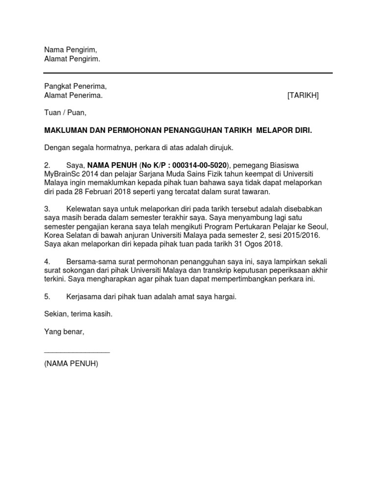 Draf Surat Pemohonan Penangguhan Lapor Diri Mybrainsc