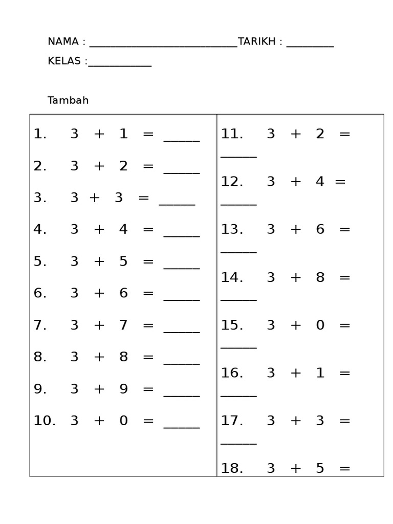 Latihan Matematik Tambah 3 Tahun 1