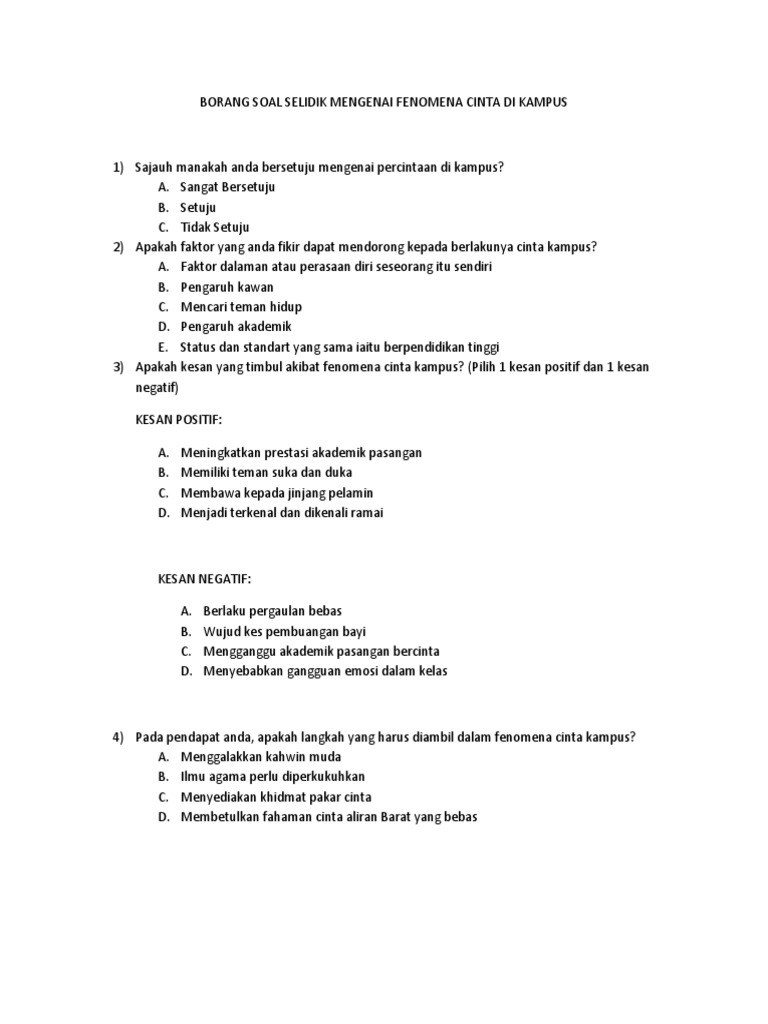 Borang Soal Selidik Mengenai Fenomena Cinta Di Kampus Docx