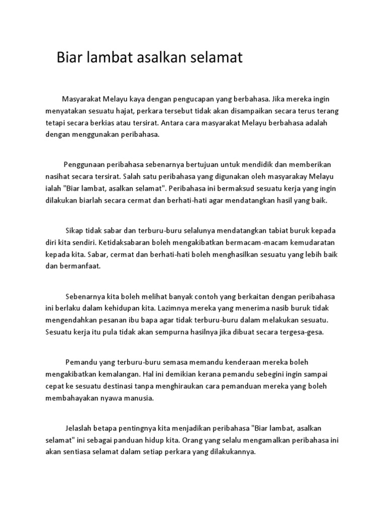 Contoh Contoh Karangan Sekolah Rendah Peribahasa Biar Lambat Asal Selamat