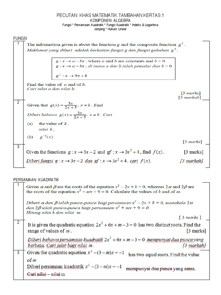 Pecutan Khas Matematik Tambahan Kertas 1 Komponen Algebra