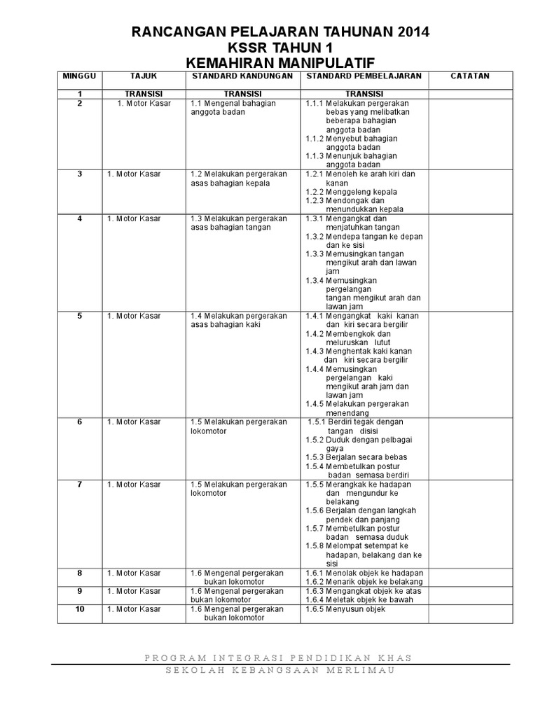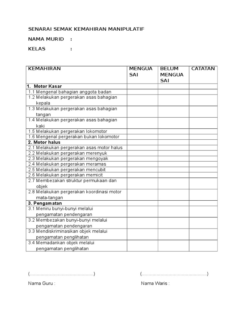 Senarai Semak Kemahiran Manipulatif Tahun 1
