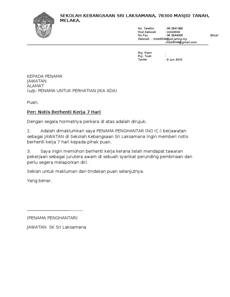Contoh Surat Berhenti Kerja Bahasa Malaysia