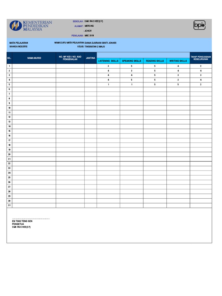 Templat Pelaporan Pbd Kssm Tingkatan 2 Bahasa Inggeris