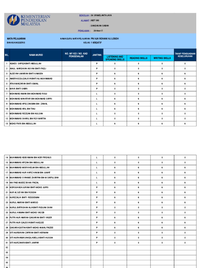 Sekolah Alamat Penilaian Bil Nama Murid Jantina No My Kid No Kad Pengenalan Tekanan Linguistik Penulisan