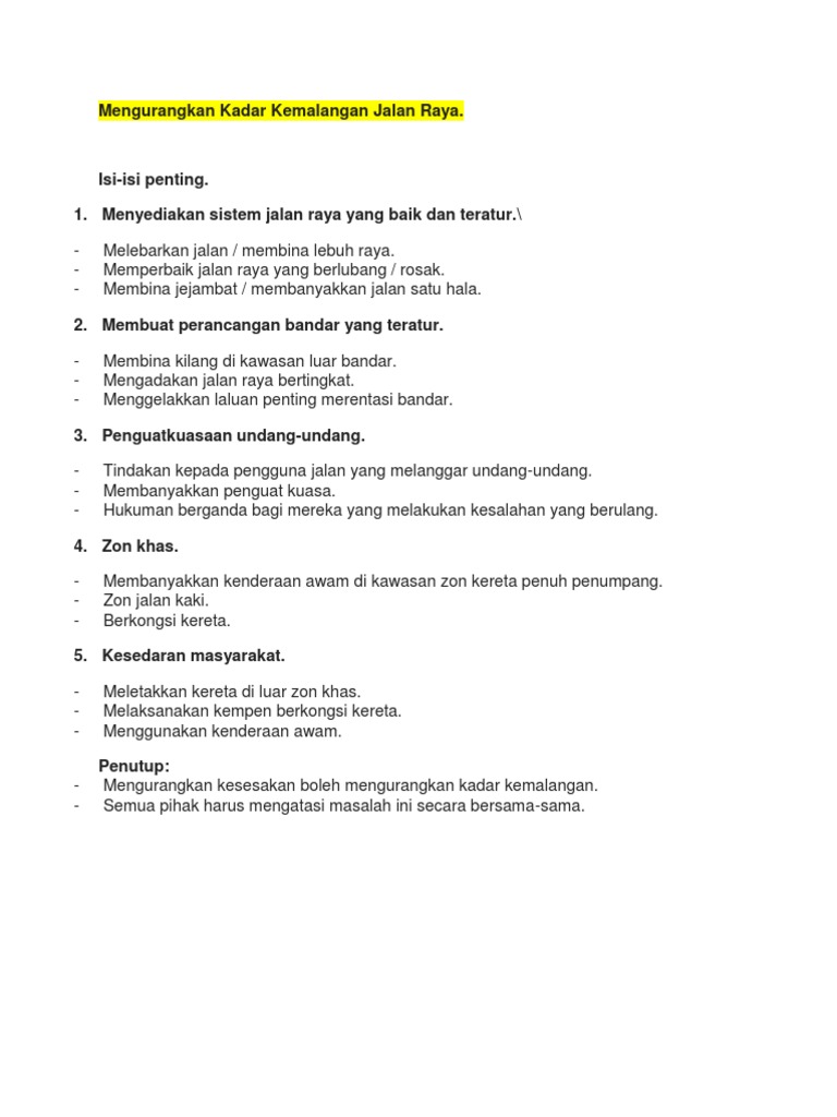 Kerangka Karangan Langkah Langkah Mengatasi Kemalangan Jalan Raya