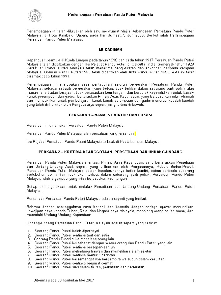 Perlembagaan Persatuan Pandu Puteri Malaysia Edited Pages 1 10 Text Version Anyflip
