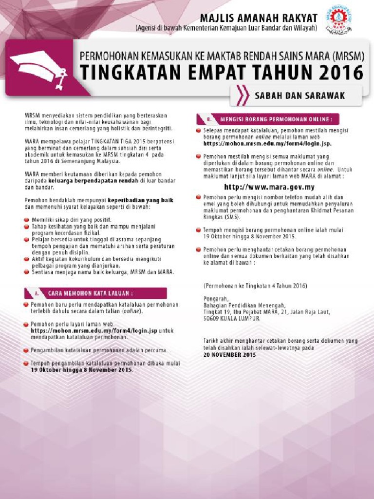 Permohonan mrsm tingkatan 4 2015. Mrsm menyediakan sistem pendidikan berteraskan sains teknologi kejuruteraan dan matematik stem bagi melahirkan insan cemerlang yang holistik inovatif dan berintegriti. Pemohon mestilah menghantar cetakan borang serta dokumen yang berkaitan ke alamat di bawah. Permohonan mrsm tingkatan 1 dan 4 2021 secara online maktab rendah sains mara. Sila klik untuk memohon.