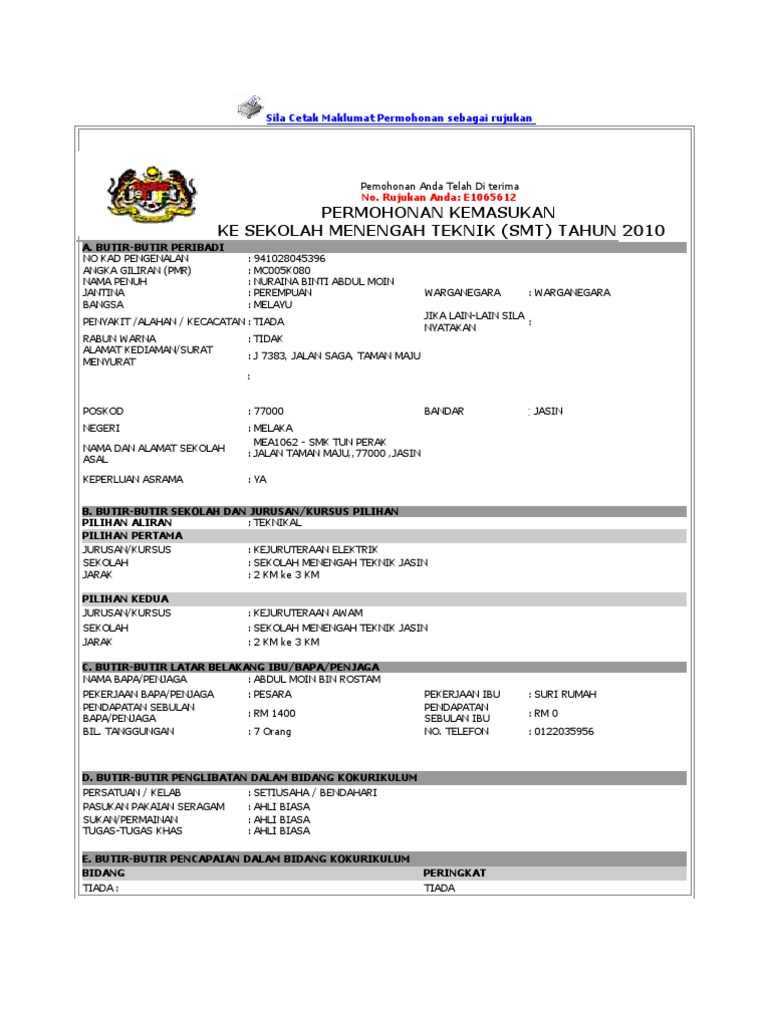 Permohonan Sekolah Menengah Teknik Secara Online Perokok Z