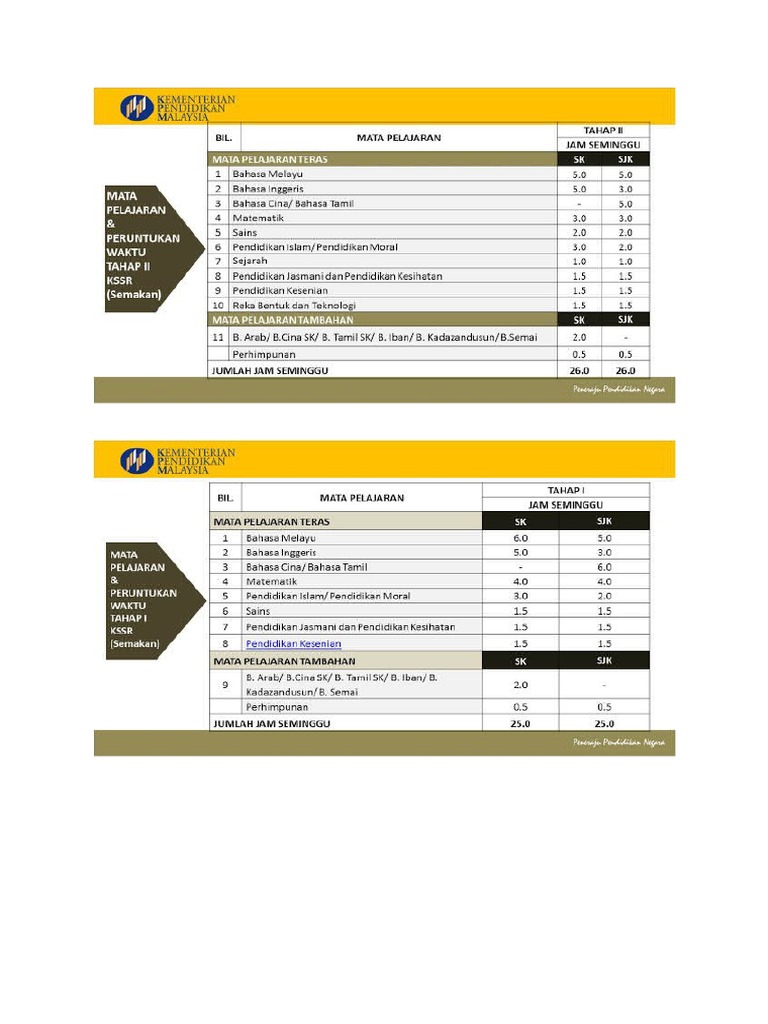 Mata Pelajaran Peruntukan Masa Minimum Jam Setahun Kssr Semakan 2017 Tahun 1 2 3 4 5 6