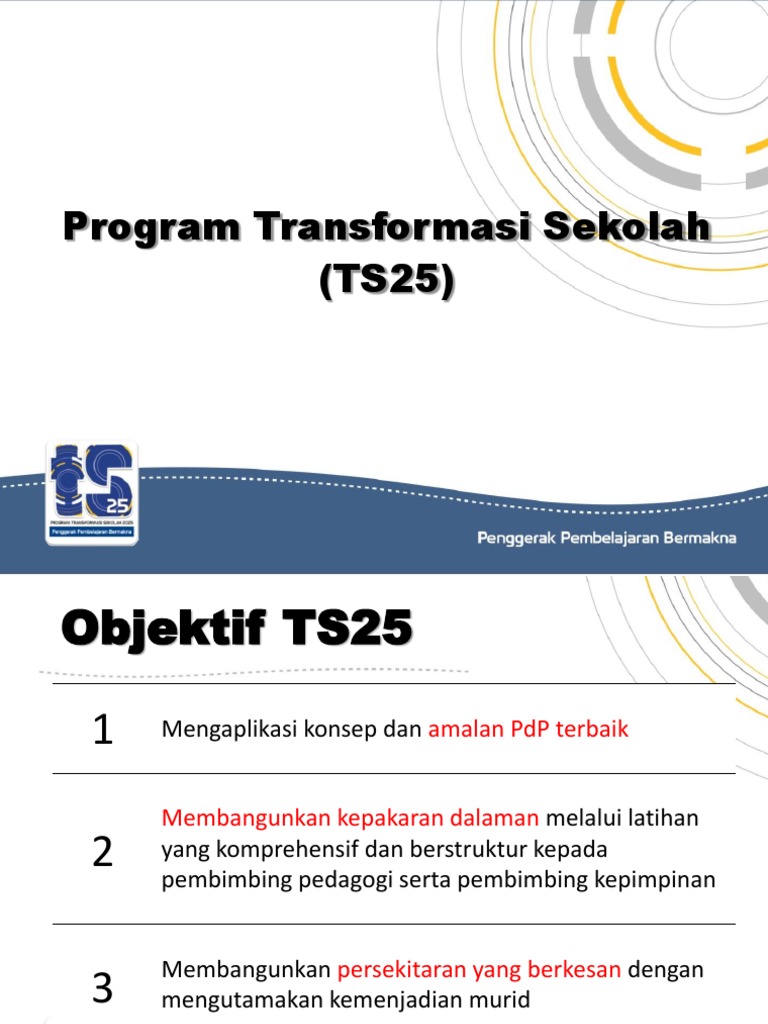 Latar belakang dan objektif program transformasi sekolah mesyuarat majlis ekonomi bil. Program transformasi sekolah 2025 ts25 program transformasi sekolah 2025 ts25 merupakan artikel ulangsiar. Program transformasi sekolah 2025 ts25 merupakan sebahagian daripada usaha kementerian pendidikan malaysia kpm ke arah meningkatkan kemenjadian murid dan sekolah berkualiti mengaplikasikan amalan terbaik dalam pelaksanaan pengurusan dan kepimpinan serta pedagogi dalam pembelajaran dan pengajaran pdp selari dengan hasrat yang terkandung dalam pelan pembangunan pendidikan malaysia pppm. Objektif program transformasi sekolah antara lain ialah.